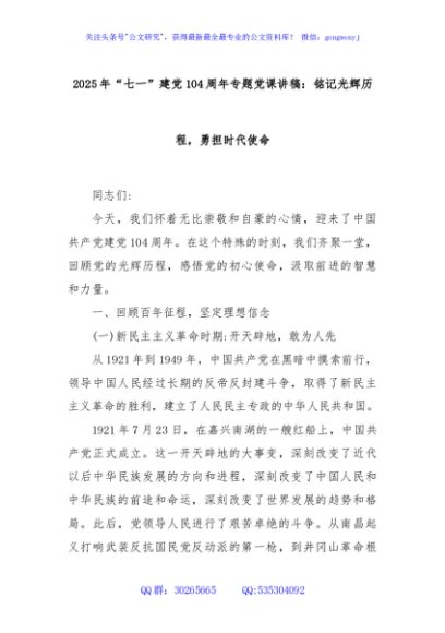 / 2025年“七一”建党104周年专题党课讲稿:铭记光辉历程,勇担时代使命