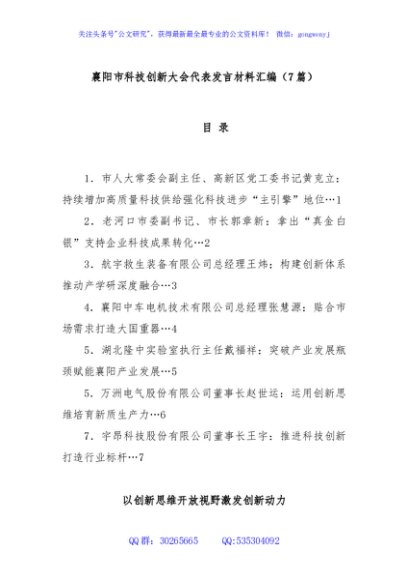 / (7篇)襄阳市科技创新大会代表发言材料汇编