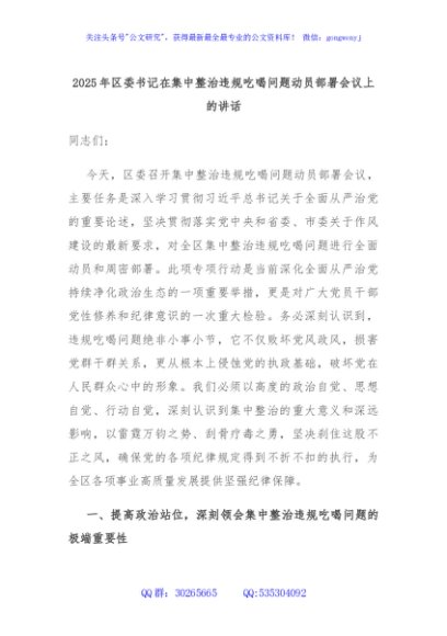 / 2025年区委书记在集中整治违规吃喝问题动员部署会议上的讲话