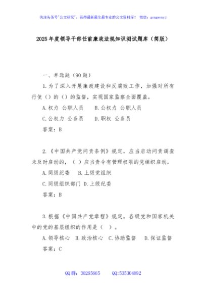 / 2025年度领导干部任前廉政法规知识测试题库(简版)