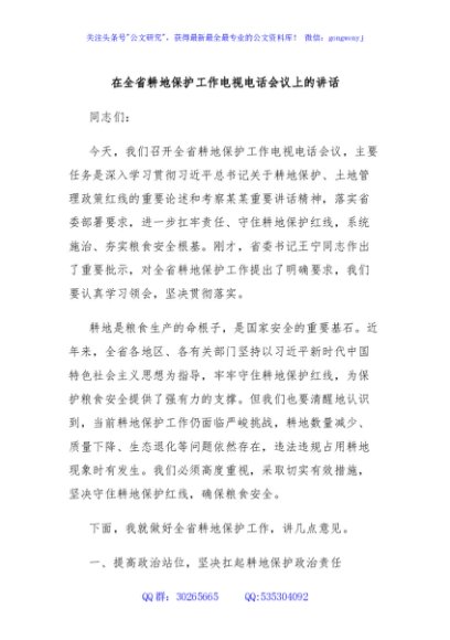 / 在全省耕地保护工作电视电话会议上的讲话