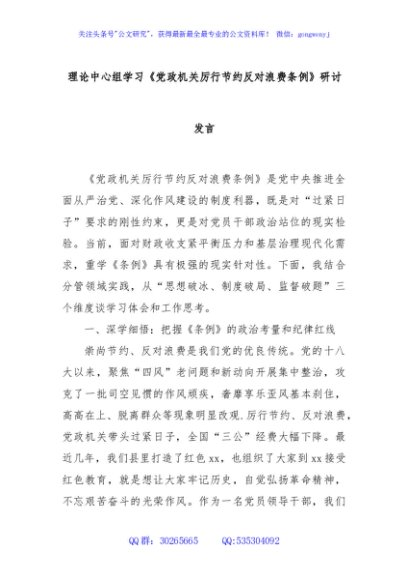 / 理论中心组学习《党政机关厉行节约反对浪费条例》研讨发言