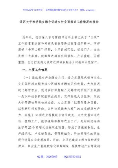 / 某区关于推动城乡融合促进乡村全面振兴工作情况的报告