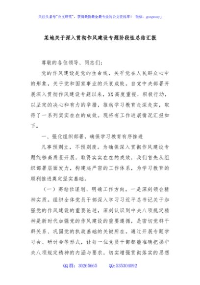 / 某地关于深入贯彻作风建设专题阶段性总结汇报
