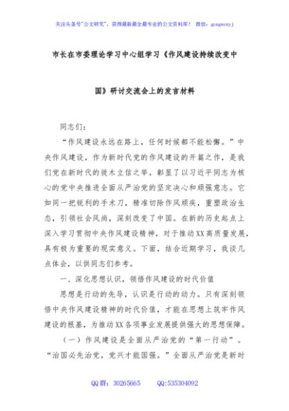 / 市长在市委理论学习中心组学习《作风建设持续改变中国》研讨交流会上的发言材料