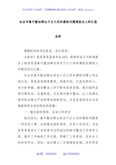 在全市集中整治群众不正之风和腐败问题调度会上的汇报材料