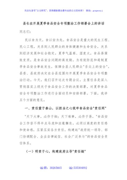 / 县长在开展夏季食品安全专项整治工作部署会上的讲话