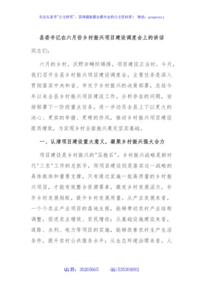 / 县委书记在六月份乡村振兴项目建设调度会上的讲话