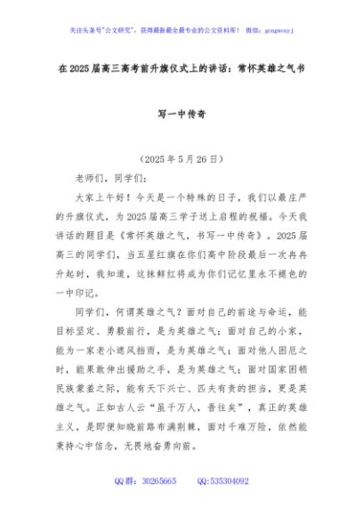 / 在2025届高三高考前升旗仪式上的讲话:常怀英雄之气书写一中传奇