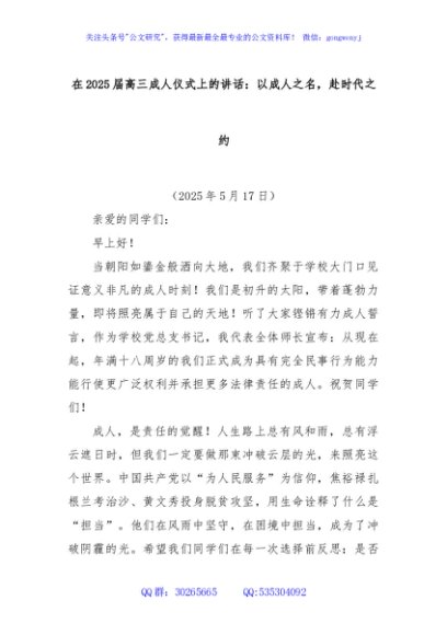 / 在2025届高三成人仪式上的讲话:以成人之名,赴时代之约