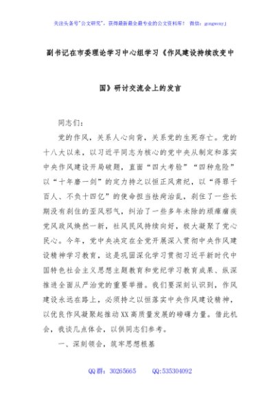 / 副书记在市委理论学习中心组学习《作风建设持续改变中国》研讨交流会上的发言
