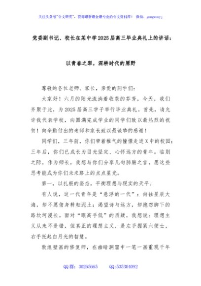 / 党委副书记、校长在某中学2025届高三毕业典礼上的讲话:以青春之犁,深耕时代的原野