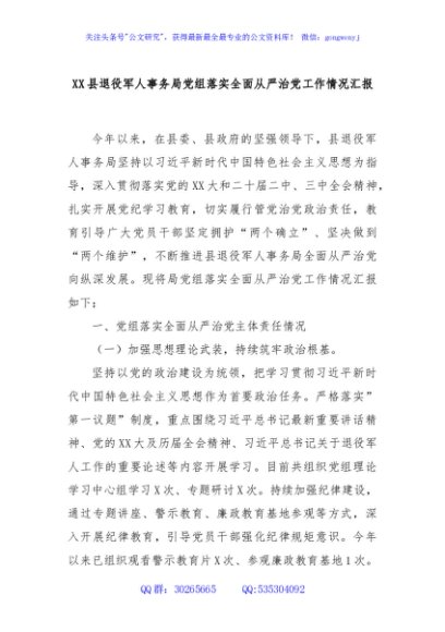 / XX县退役军人事务局党组落实全面从严治党工作情况汇报