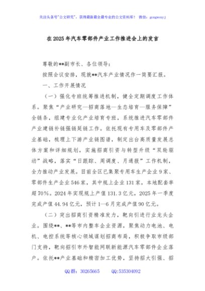 / 在2025年汽车零部件产业工作推进会上的发言