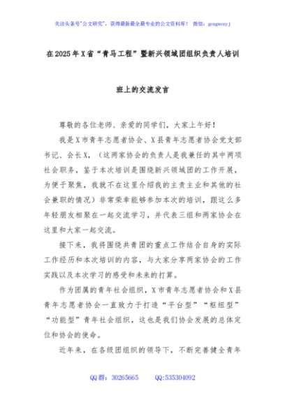 / 在2025年X省“青马工程”暨新兴领域团组织负责人培训班上的交流发言