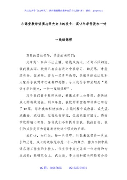 / 在课堂教学讲赛总结大会上的发言:莫让年华付流水一针一线织锦程