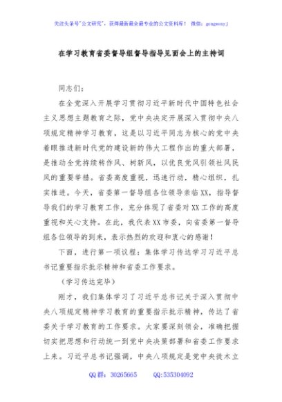 / 在学习教育省委督导组督导指导见面会上的主持词