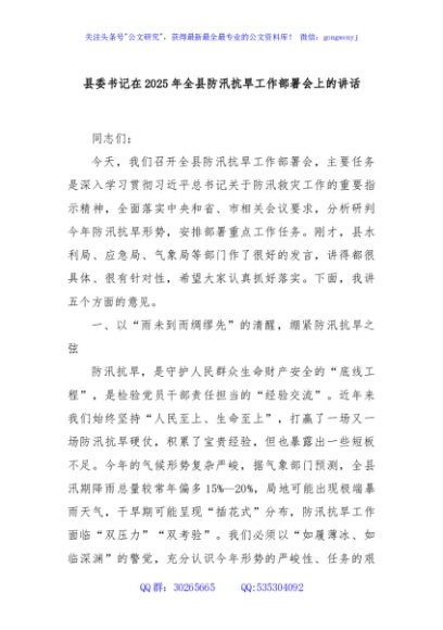 / 县委书记在2025年全县防汛抗旱工作部署会上的讲话