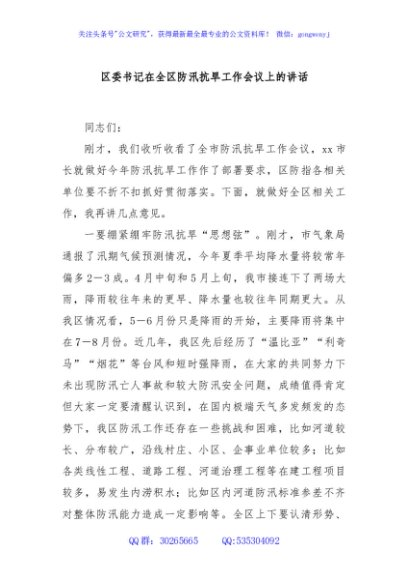 / 区委书记在全区防汛抗旱工作会议上的讲话
