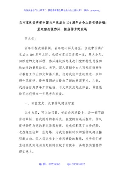 / 在市直机关庆祝中国共产党成立104周年大会上的党课讲稿:坚定信念强作风,担当作为促发展