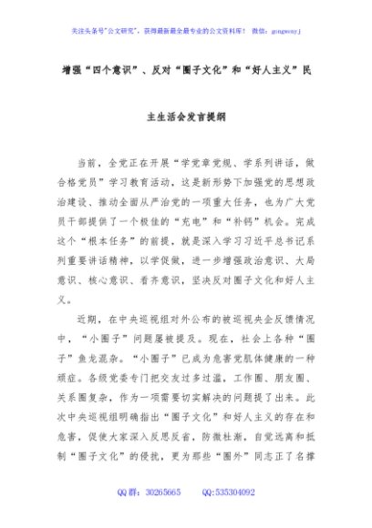 / 增强“四个意识”、反对“圈子文化”和“好人主义”民主生活会发言提纲