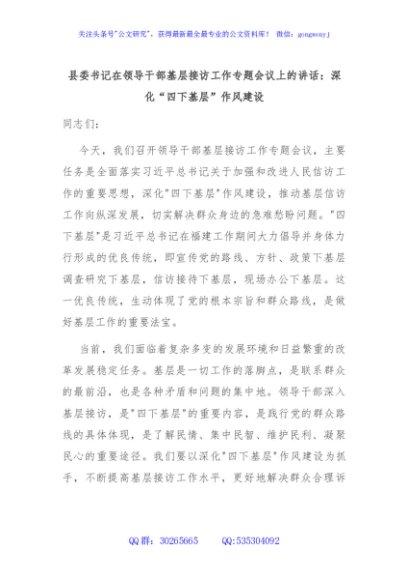 / 县委书记在领导干部基层接访工作专题会议上的讲话:深化“四下基层”作风建设