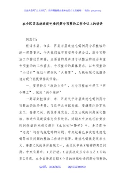 / 在全区某系统违规吃喝问题专项整治工作会议上的讲话