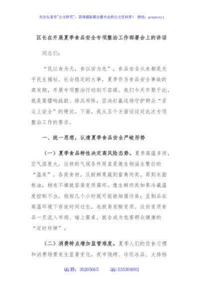 / 区长在开展夏季食品安全专项整治工作部署会上的讲话