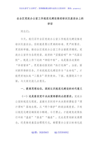 / 在全区党政办公室工作规范化建设推进培训及座谈会上的讲话