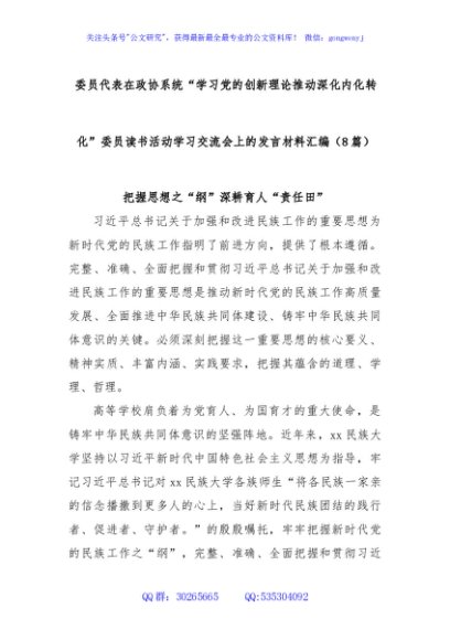 / (8篇)委员代表在政协系统“学习党的创新理论推动深化内化转化”委员读书活动学习交流会上的发言材料汇编