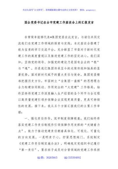 / 国企党委书记在全市党建工作座谈会上的汇报发言