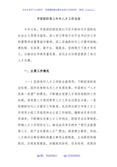 / 市委组织部上半年人才工作总结