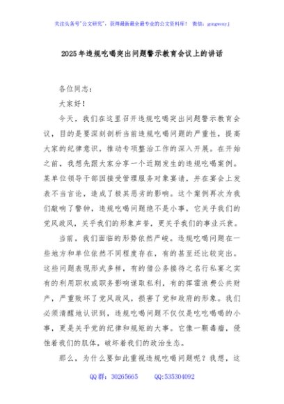 / 2025年违规吃喝突出问题警示教育会议上的讲话