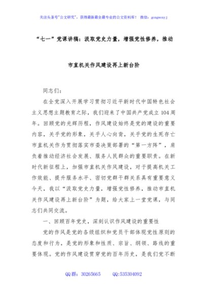 / “七一”党课讲稿:汲取党史力量,增强党性修养,推动市直机关作风建设再上新台阶