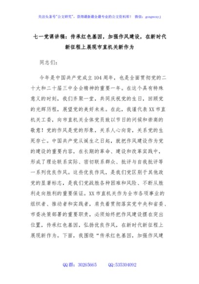 / 七一党课讲稿:传承红色基因,加强作风建设,在新时代新征程上展现市直机关新作为