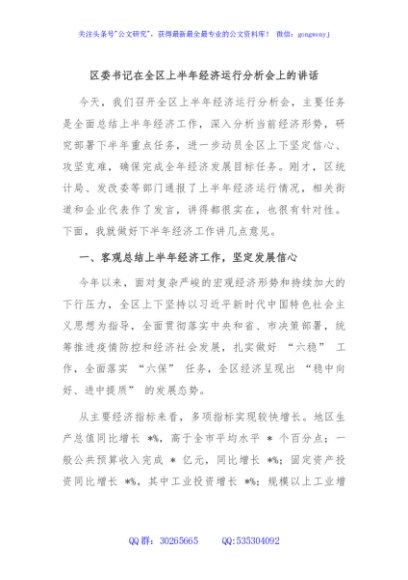 / 区委书记在全区上半年经济运行分析会上的讲话