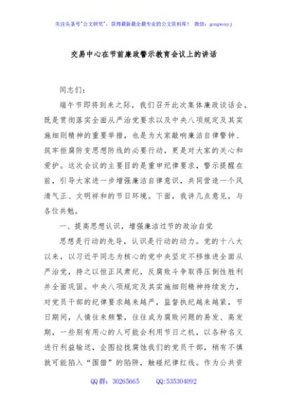 / 交易中心在节前廉政警示教育会议上的讲话