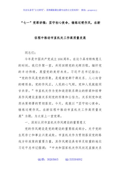 / “七一”党课讲稿:坚守初心使命,锤炼过硬作风,在新征程中推动市直机关工作高质量发展