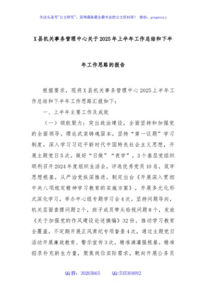 / X县机关事务管理中心关于2025年上半年工作总结和下半年工作思路的报告