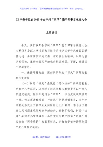 / XX市委书记在2025年全市纠“四风”暨干部警示教育大会上的讲话