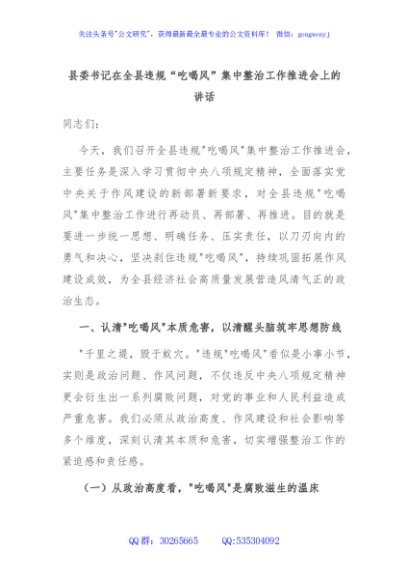 / 县委书记在全县违规“吃喝风”集中整治工作推进会上的讲话