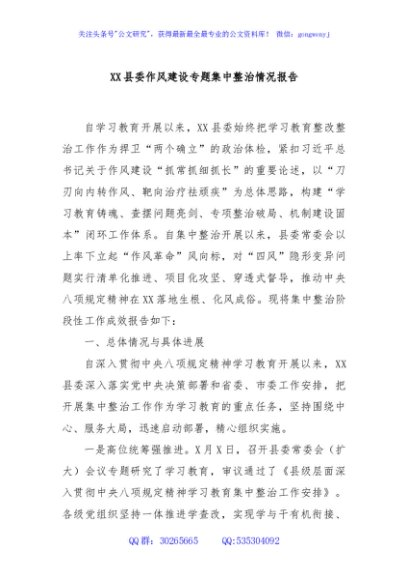 / XX县委作风建设专题集中整治情况报告