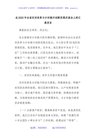 / 在2025年全省农村改革与乡村振兴创新实践交流会上的汇报发言