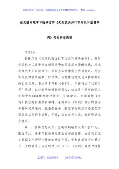 / 在党组专题学习新修订的《党政机关厉行节约反对浪费条例》时的讲话提纲
