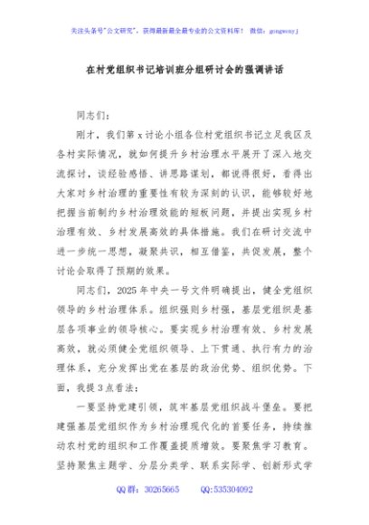 / 在村党组织书记培训班分组研讨会的强调讲话