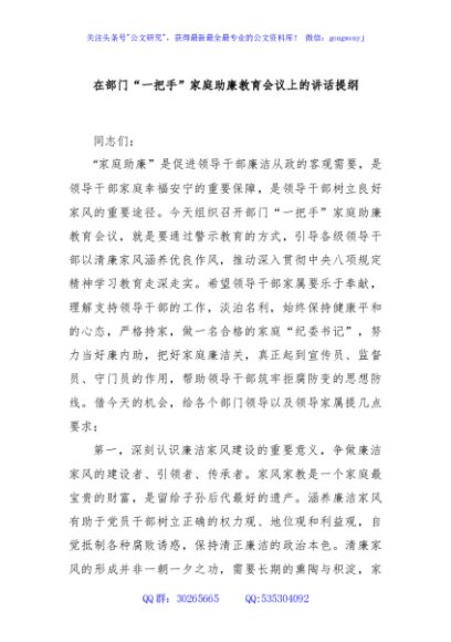 / 在部门“一把手”家庭助廉教育会议上的讲话提纲