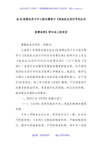 / 在XX局理论学习中心组专题学习《党政机关厉行节约反对浪费条例》研讨会上的发言