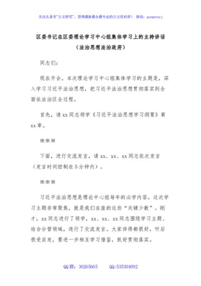 / 区委书记在区委理论学习中心组集体学习上的主持讲话(法治思想法治政府)