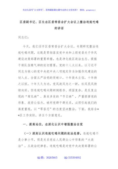 / 区委副书记、区长在区委常委会扩大会议上整治违规吃喝的讲话