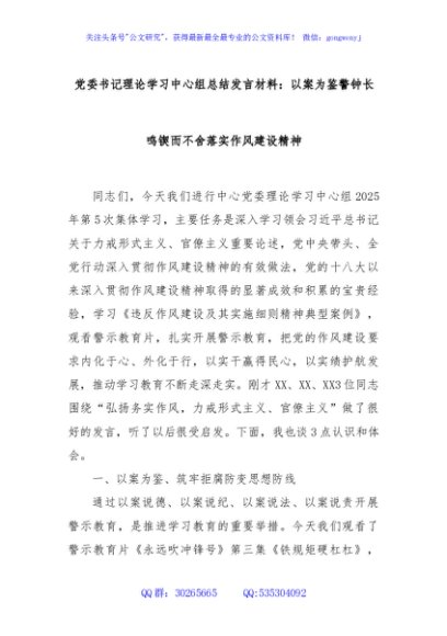 党委书记理论学习中心组总结发言材料:以案为鉴警钟长鸣锲而不舍落实作风建设精神